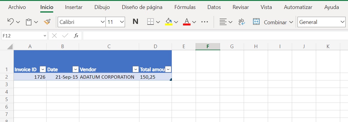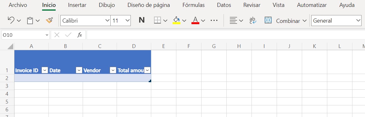 Ahora que tiene la tabla configurada, puede agregar la información de la factura extraída a la hoja de cálculo de Excel.