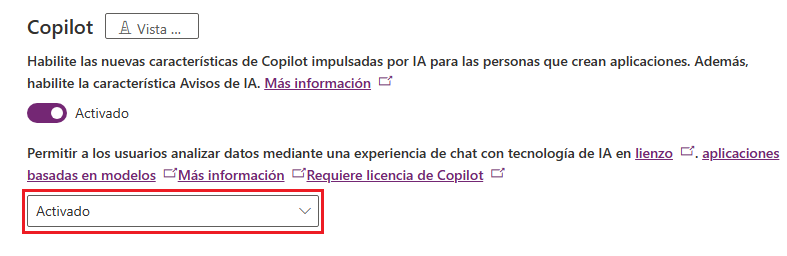 Para usar Copilot en aplicaciones basadas en modelo, debe habilitarlo en su entorno de Microsoft Power Platform.