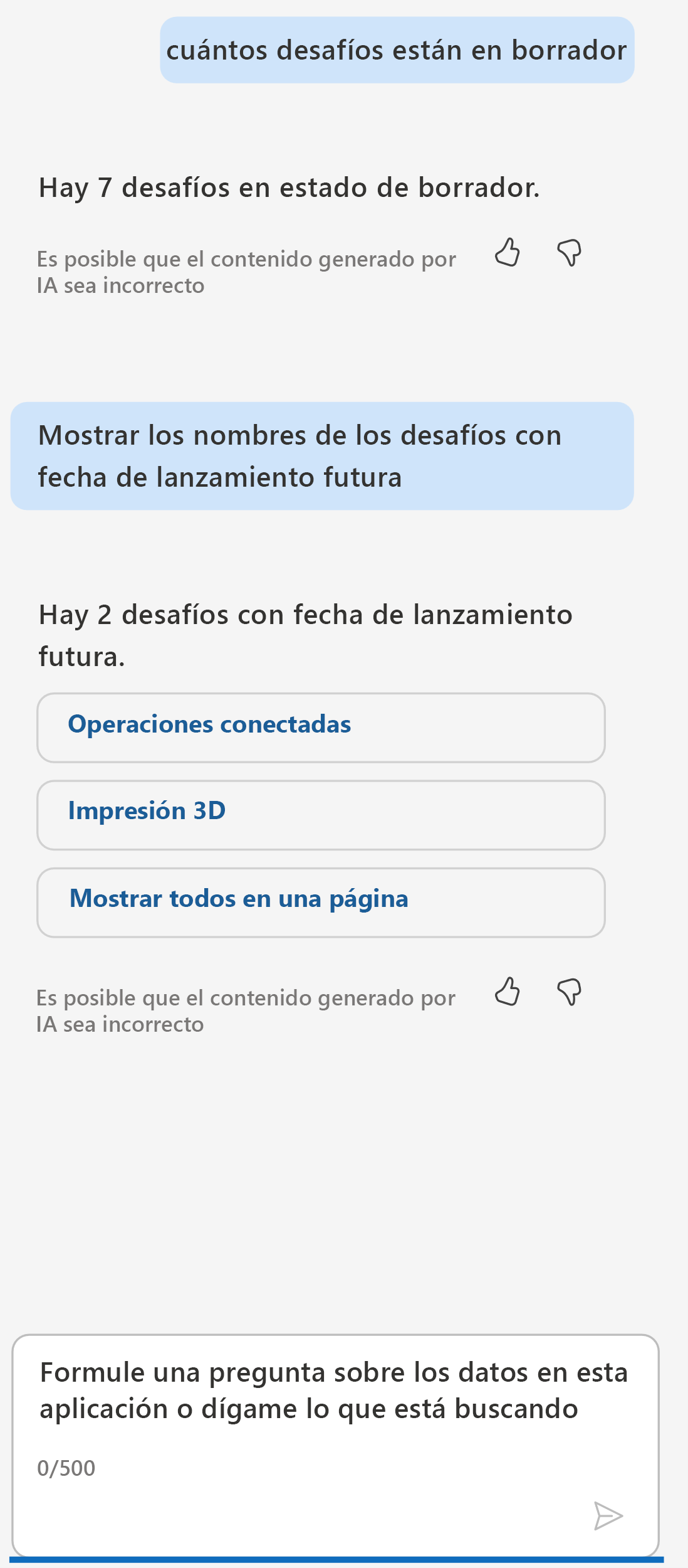 Los usuarios pueden ayudar a mejorar la precisión del agente enviando comentarios. De forma predeterminada, los agentes incluyen una característica de comentarios donde los usuarios pueden proporcionar una respuesta (pulgar hacia arriba o hacia abajo) o introducir comentarios más detallados.