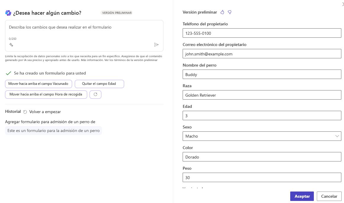 La siguiente imagen muestra la solicitud "agregar formulario para enrega de perros". Como puede ver, hay un error ("enrega" en lugar de "entrega"). A pesar de esto, Copilot presenta un formulario para atender la solicitud.