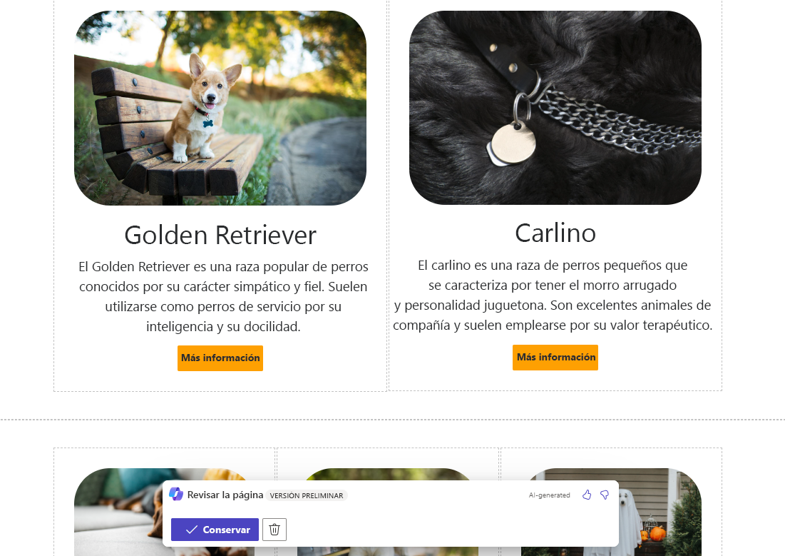 Cuando le pide a Copilot que cree una nueva página o sección, este genera la página o sección y le ofrece una vista previa. Puede aceptar o rechazar la nueva página o sección antes de que Copilot la aplique. Tenga en cuenta que las imágenes pueden no coincidir con el texto, así que es importante que las revise. Tras aceptar la nueva página o sección, puede continuar editando mediante la funcionalidad estándar en Power Pages.
