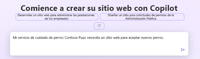 Escribir una breve descripción del sitio que desea crear para que Copilot pueda transformar su descripción en un sitio web completamente funcional.