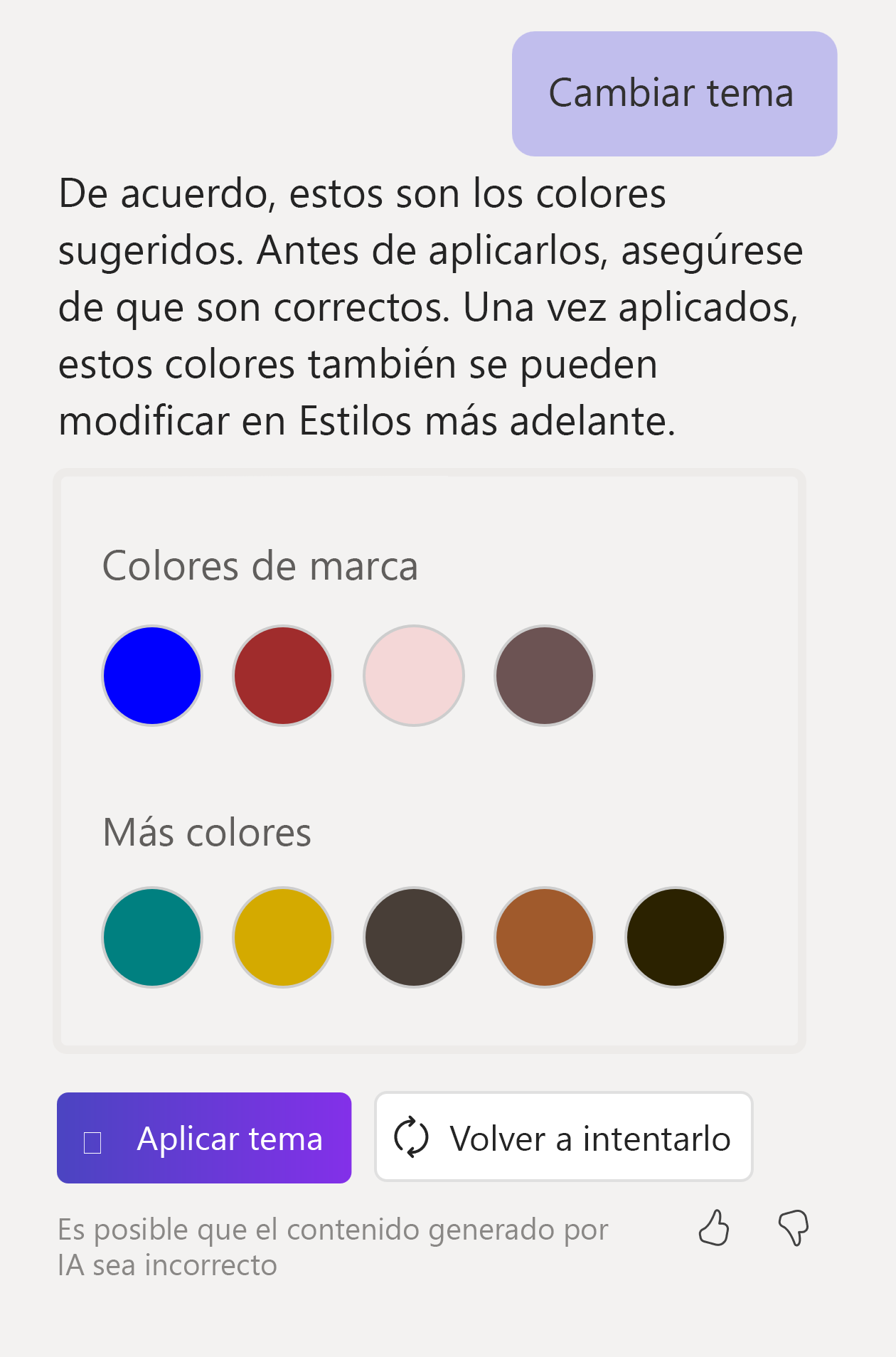 Cuando le pide a Copilot que haga cambios en el tema, este le presenta opciones de color en el cuadro de diálogo de Copilot. Luego, puede seleccionar el color para que Copilot lo aplique. Si desea probar diferentes temas de colores, puede seguir diciéndole a Copilot que muestre más opciones y que pruebe varios colores antes de la selección final.