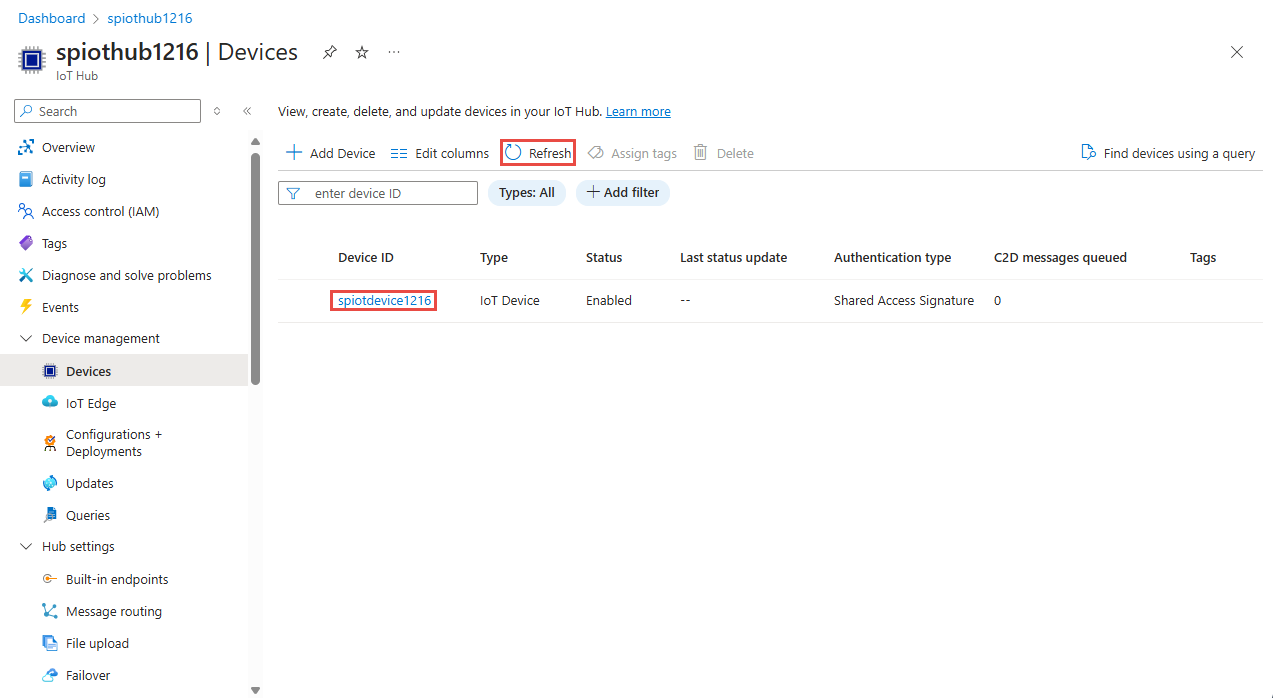 Once the device is created, you should see the device from the IoT devices list. Select Refresh button on the page if you don't see it.