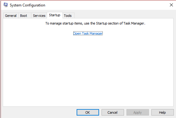- בכרטיסיה אתחול של תיבת הדו-שיח תצורת המערכת, הקש על או פתח את מנהל המשימות.