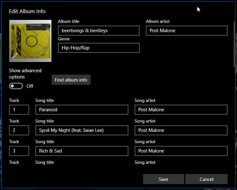 לחץ על סמל העט באלבום ולאחר מכן נווט כדי למצוא את תמונת התמונה שאתה רוצה לנו עבור הרצועה או הטאקים האלה.