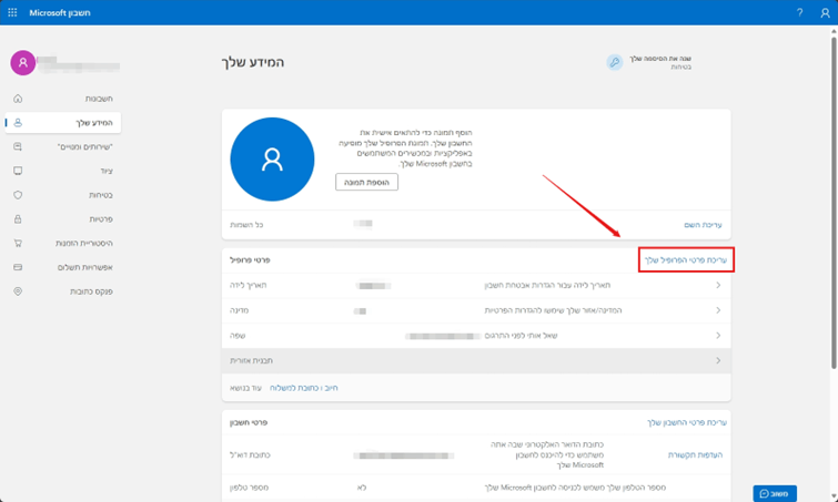 במידע אישי, לחץ על ערוך פרטי פרופיל בצד ימין ולאחר האימות תוכל לשנות את תאריך הלידה שלך.
