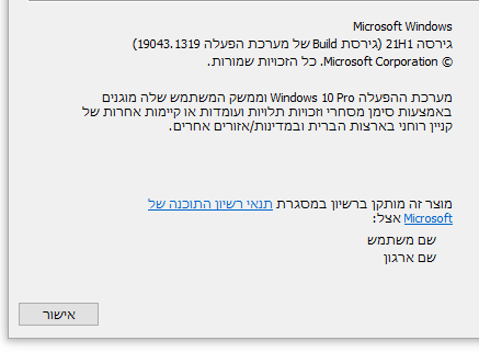 4.מהי הגירסה המדוייקת של Windows 10 שלך? ניתן לגלות זאת על ידי הקשת winver בשורת החיפוש ולחיצה על אנטר. (נא לספק את הגירסה והבילד)
