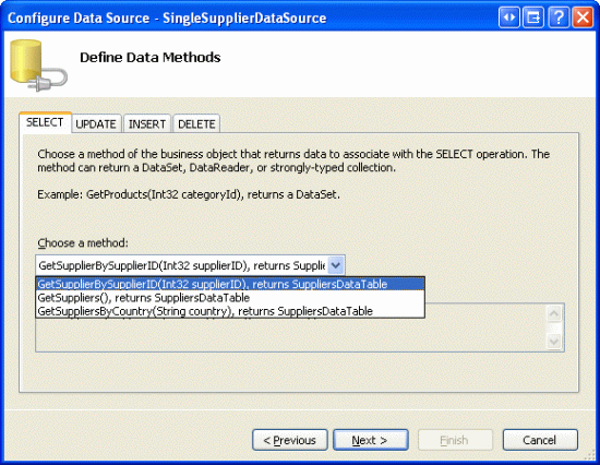 Since we want this DropDownList to include all suppliers, configure the ObjectDataSource to invoke the SuppliersBLL class s GetSuppliers() method. Also ensure that the ObjectDataSource s Update() method is mapped to the SuppliersBLL class s UpdateSupplierAddress method, as this ObjectDataSource will also be used by the DetailsView we'll be adding in Step 2.