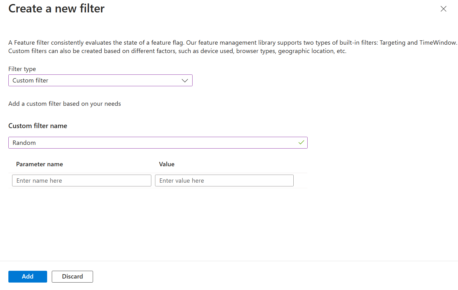 The Microsoft feature management libraries include the following built-in feature filters, which you can configure in the Azure portal: