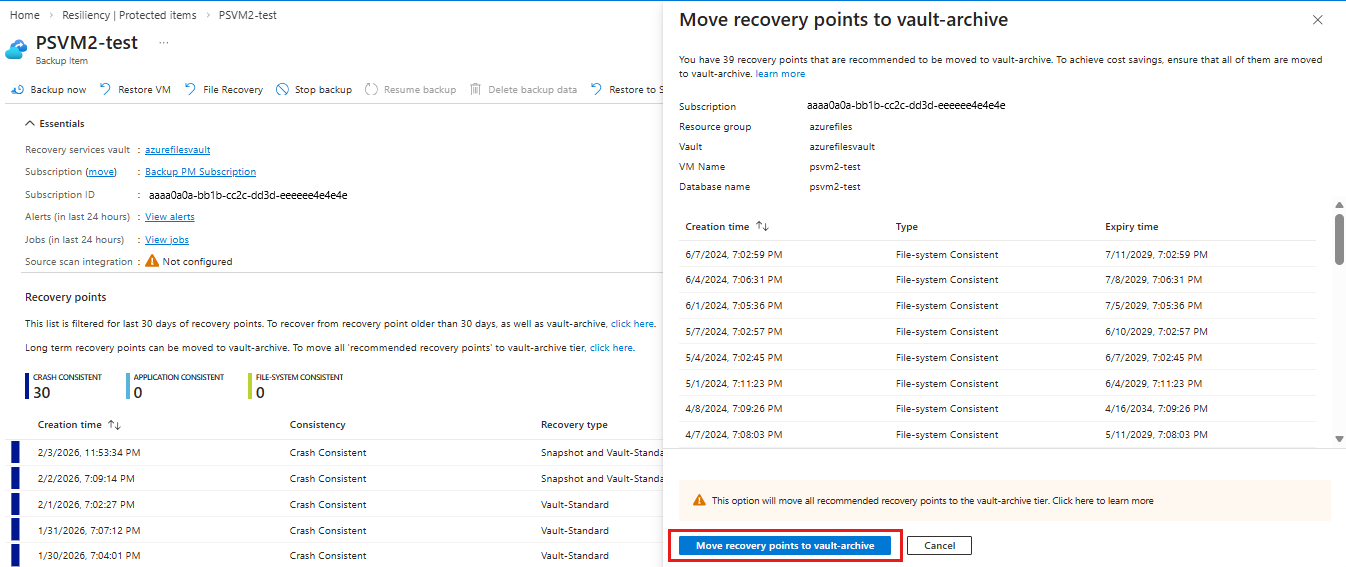 - Recommended recovery points: This option moves all recommended recovery points to the vault-archive tier. Learn more about recommendations.