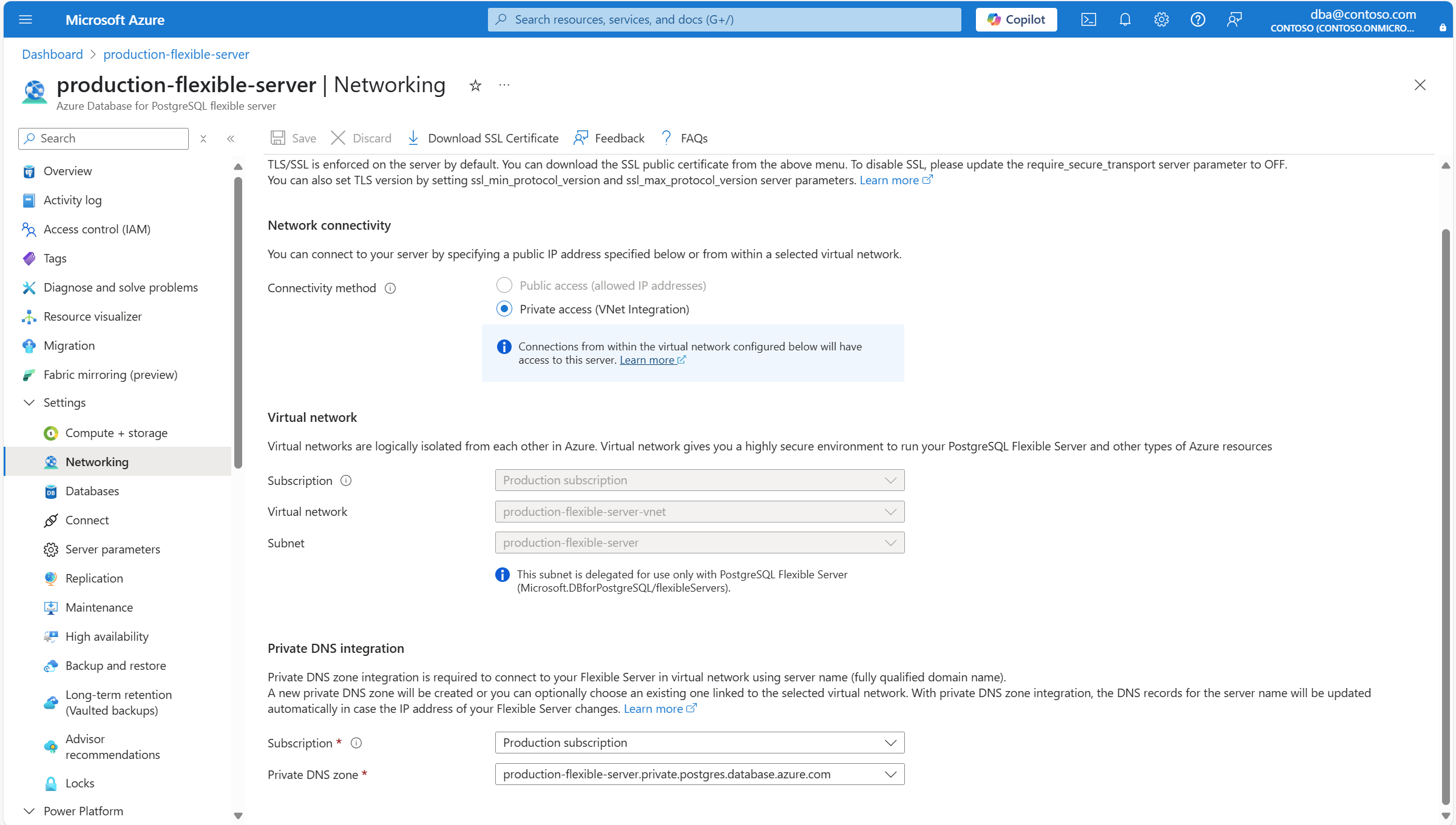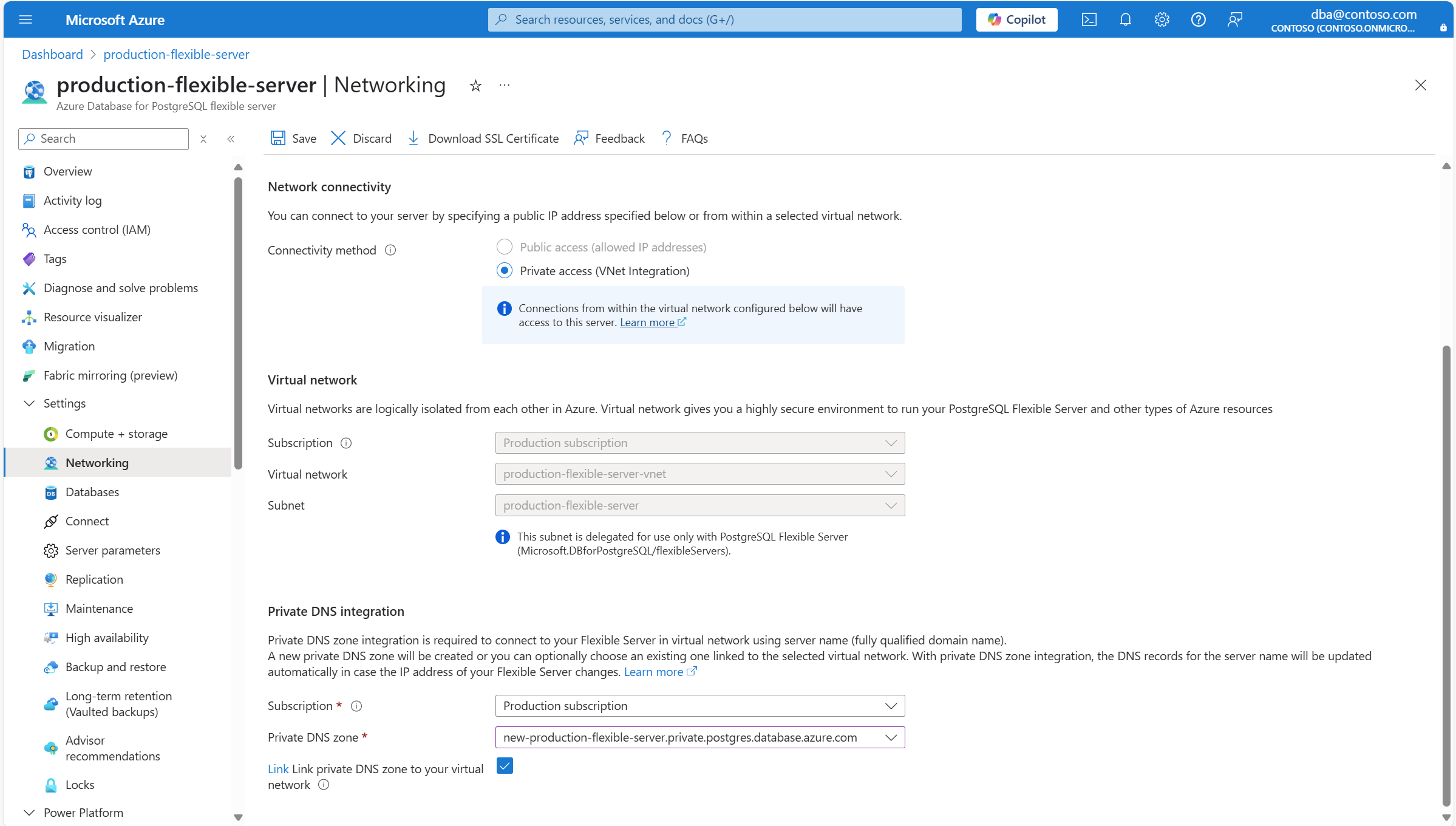 The only network related modifiable setting for servers deployed with Private access (VNET Integration) is the private DNS zone in which the server is integrated. To change it, in the Private DNS integration section, expand the Subscription and Private DNS zone comboboxes to select an existing private DNS zone in which you want to integrate your server.