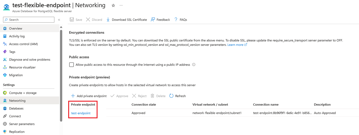 - Record the virtual network and subnet details that are listed under the private endpoint connection of the flexible server.