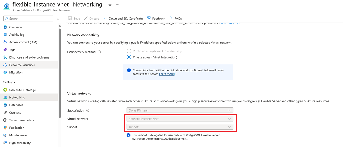Select the virtual network and the specific subnet that's associated with your flexible server.