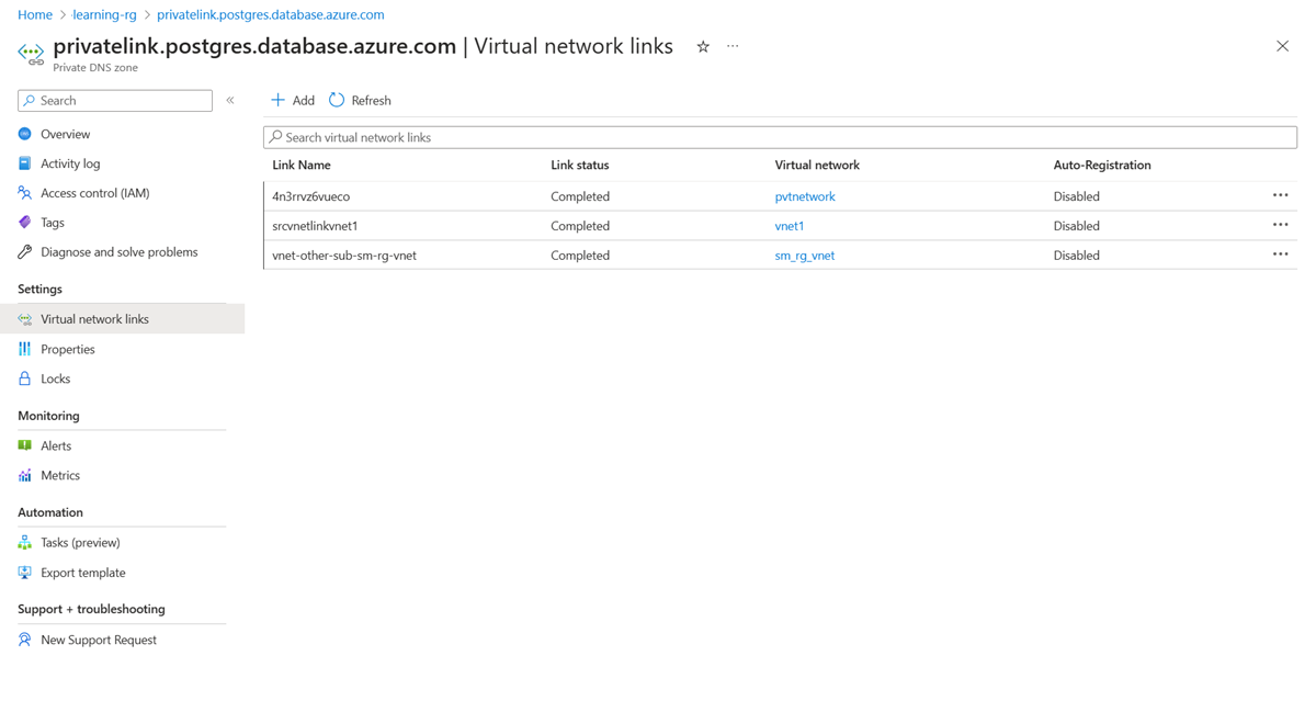 Select the private DNS zone on your single server's private endpoint. Check whether the VNets of the single server and the flexible server appear in the virtual network links. If they aren't, complete the steps that are described earlier to add the links to the virtual networks of the single server and the flexible server to this private DNS zone.