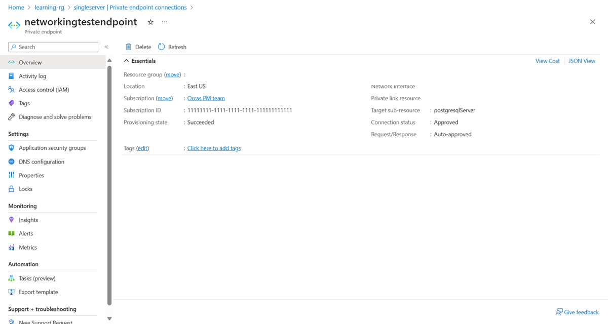 In the Azure portal, go to the instance of Azure Database for PostgreSQL - Single Server. Select the private endpoint to view its virtual network and subnet details.