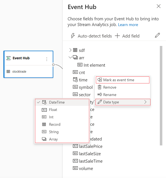 You can edit the field names, or remove field, or change the data type, or change the event time (Mark as event time: TIMESTAMP BY clause if a datetime type field), by selecting the three-dot symbol next to each field. You can also expand, select, and edit any nested fields from the incoming messages, as shown in the following image.