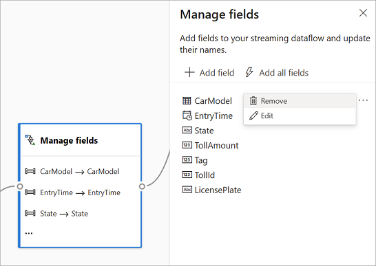 The Manage fields transformation allows you to add, remove, or rename fields coming in from an input or another transformation. The settings on the side pane give you the option of adding a new one by selecting Add field or adding all fields at once.