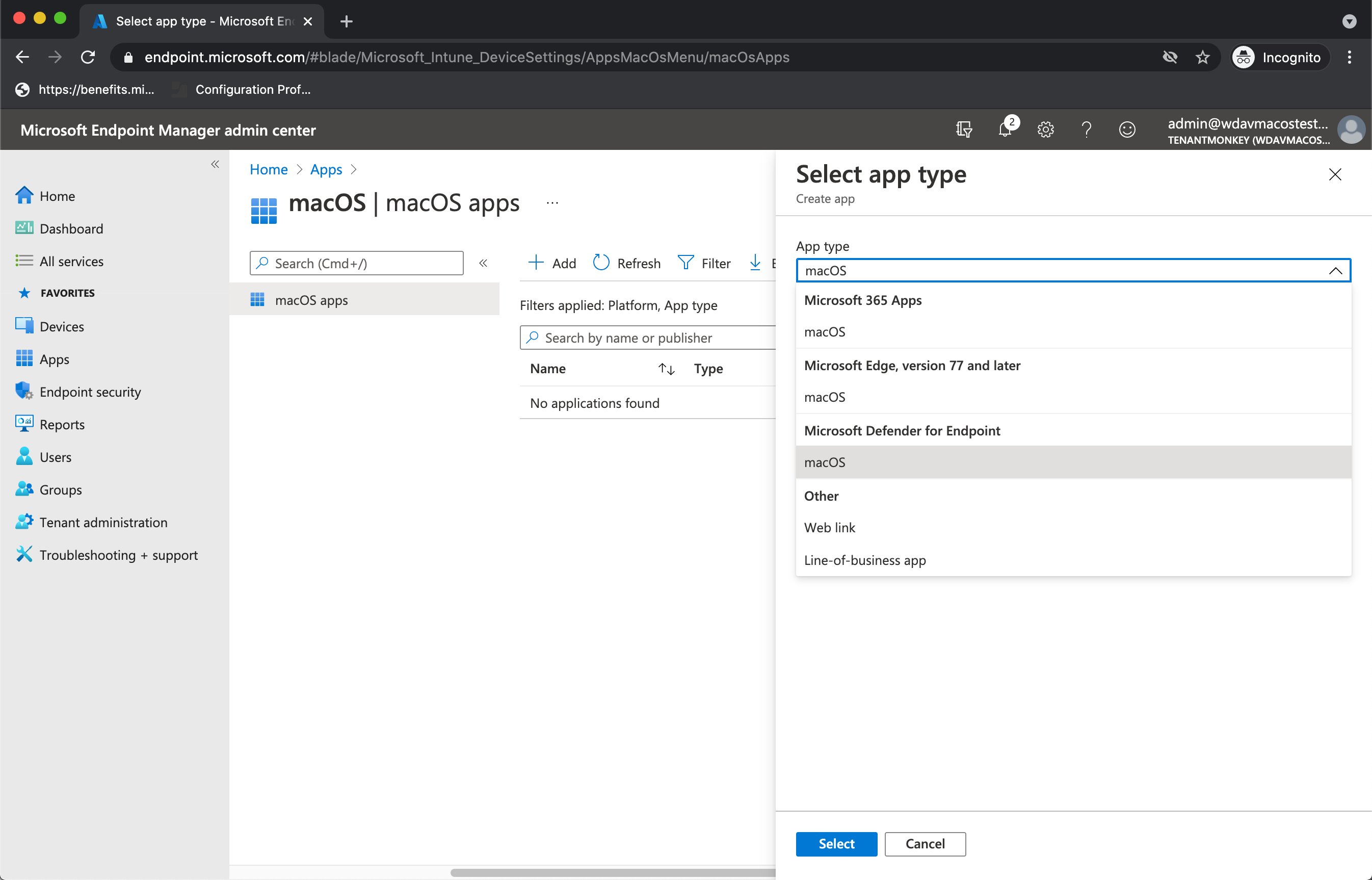 תחת סוג יישום, בחר Microsoft Defender עבור נקודת קצה >macOS ולאחר מכן בחר בחר.