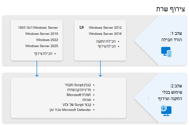 הוראות צירוף אלה עבור גירסאות Windows Server אחרות חלות גם אם אתה משתמש ב- Defender for Endpoint הקודם עבור Windows Server 2016 ו- Windows Server 2012 R2 המחייב שימוש ב- MMA. הוראות להעברה לפתרון המאוחד החדש נמצאות בתרחישי העברת שרת ב- Defender for Endpoint.
