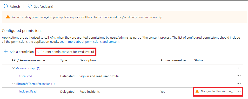 בדף היישום שלך, בחר הרשאות API>> הוסף ממשקי API של הרשאות שהארגון שלי משתמשבהם>, הקלד Microsoft Threat Protection ובחר Microsoft Threat Protection. האפליקציה שלך יכולה כעת לגשת Microsoft Defender XDR.