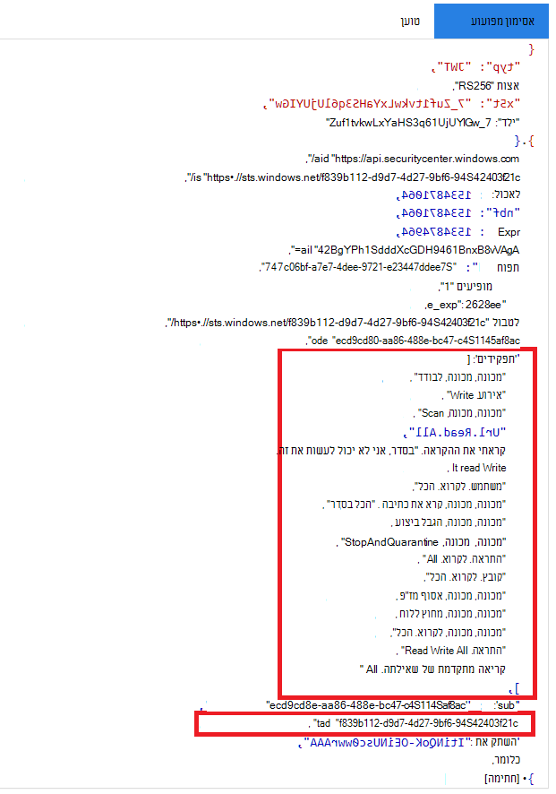 בתמונה הבאה, באפשרותך לראות אסימון פענוח שנרכש מיישום, עם Incidents.Read.All, Incidents.ReadWrite.Allוהרשאות AdvancedHunting.Read.All :