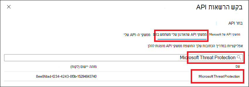 בדף היישום שלך, בחר הרשאות API>> הוסף ממשקי API של הרשאות שהארגון שלי משתמשבהם>, הקלד Microsoft Threat Protection ובחר Microsoft Threat Protection. האפליקציה שלך יכולה כעת לגשת Microsoft Defender XDR.
