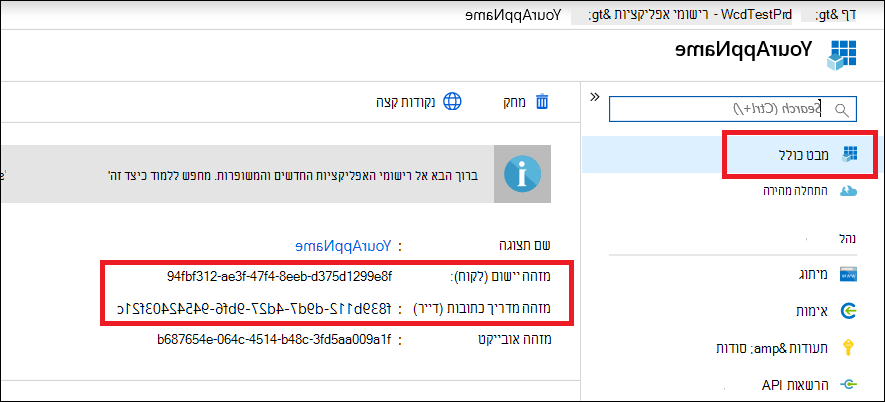 הקלט את מזהה היישום ואת מזהה הדייר שלך במקום בטוח. הן מופיעות תחת מבט כולל בדף היישום שלך.