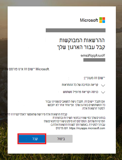 00000000-0000-0000-0000-000000000000הספרות ב'מזהה היישום' שלך.לאחר לחיצה על קישור ההסכמה, היכנס כמנהל מערכת של הדייר של המשתמש והענק הסכמה עבור היישום.