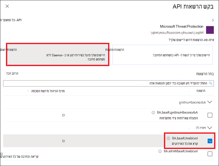 בחר הרשאות יישום. בחר את ההרשאות הרלוונטיות עבור התרחיש שלך (לדוגמה, Incident.Read.All) ולאחר מכן בחר הוסף הרשאות.