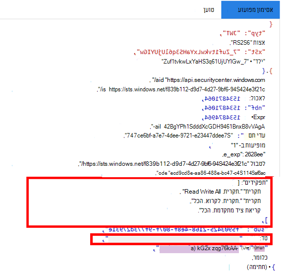 בתמונה הבאה, באפשרותך לראות אסימון פענוח שנרכש מיישום, עם Incidents.Read.All, Incidents.ReadWrite.Allוהרשאות AdvancedHunting.Read.All :