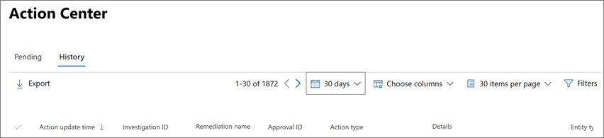 הקפד לסקור ולאשר (או לדחות) פעולות ממתינות בהקדם האפשרי כדי שהחקירות האוטומטיות שלך יוכלו להסתיים בזמן.היסטוריה משמש כיומן ביקורת עבור פעולות שבוצעו, כגון: - פעולות תיקון שבוצעו כתוצאה מחקירות אוטומטיות