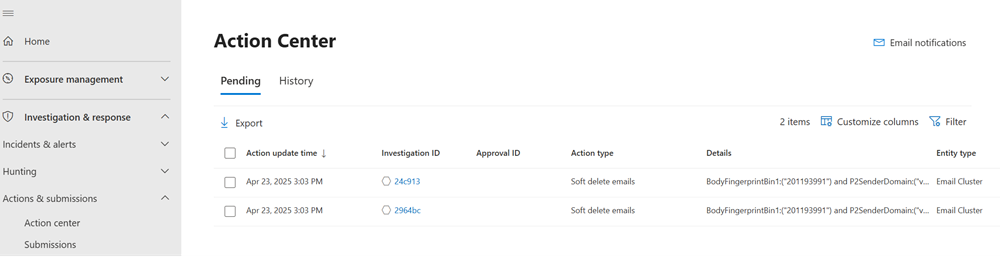 בחלונית הניווט תחת פעולות ושליחה, בחר מרכז הפעולות. לחלופין, בחקירה האוטומטית, & התגובה בדף הבית, בחר הצג פעולות ממתינות.