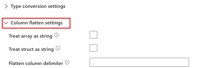 | Flatten column delimiter | Specify the flatten column delimiter, and the default is .. This setting isn't available when you enable Treat struct as string. |