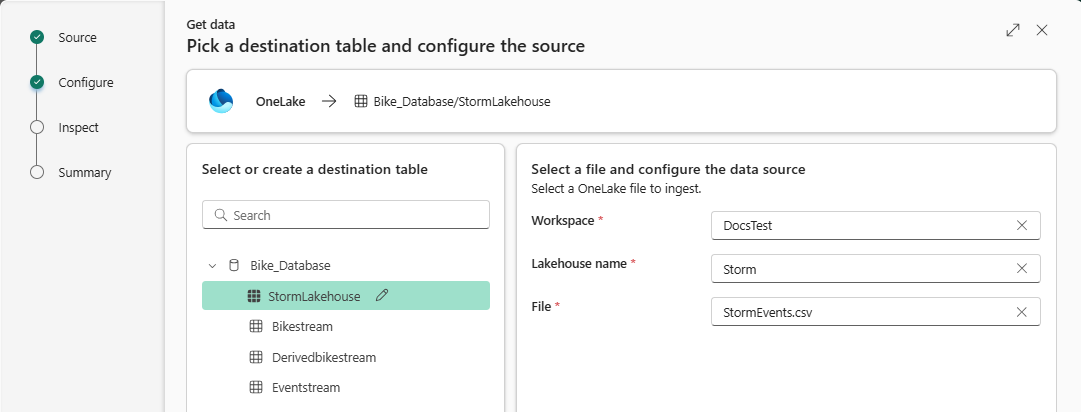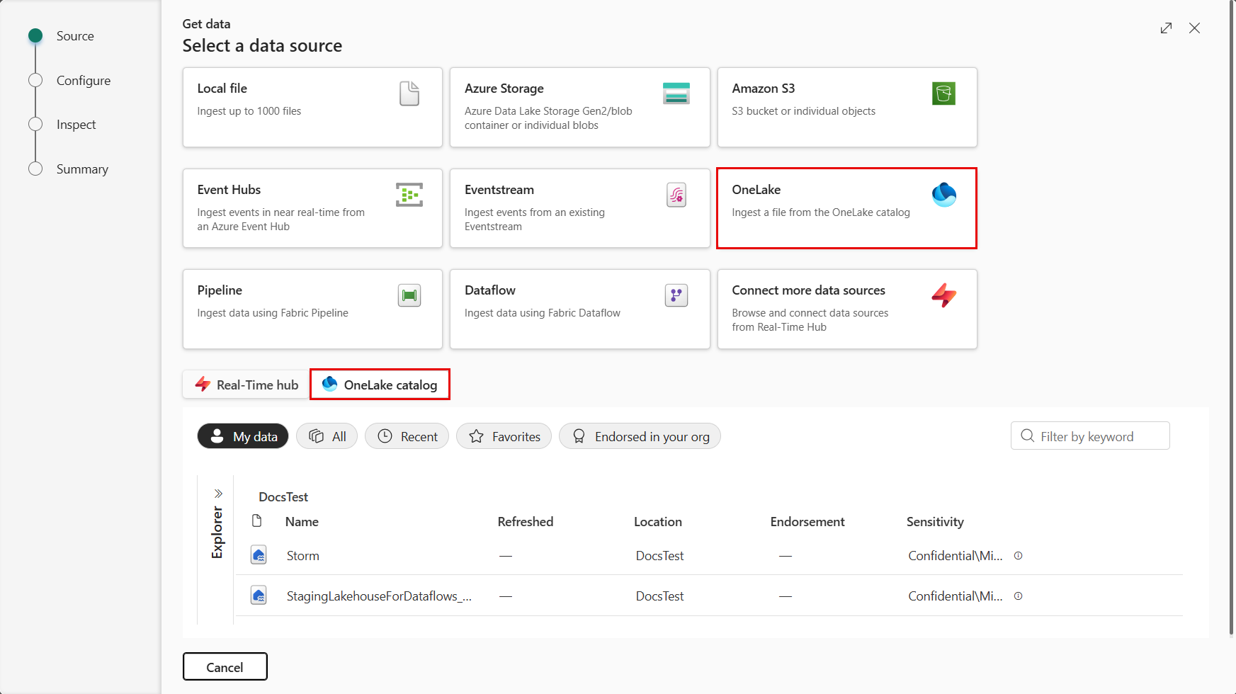 Select the data source. In this example, you're ingesting data from OneLake or from the list in the embedded OneLake catalog.