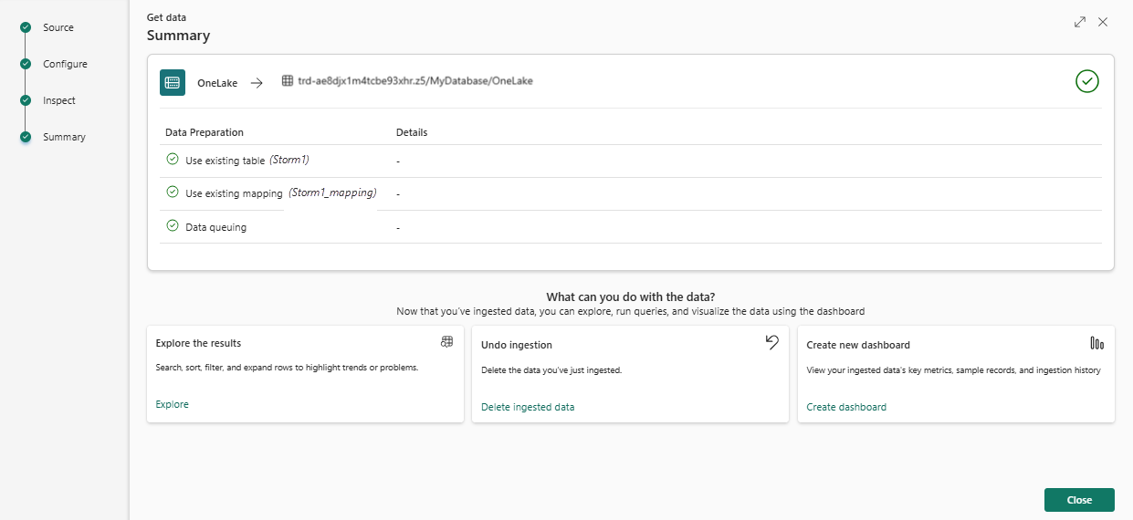In the Data preparation window, all three steps are marked with green check marks when data ingestion finishes successfully. You can select a card to query, drop the ingested data, or see a dashboard of your ingestion summary.