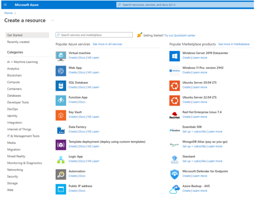 Select the See more in Marketplace link on the top right to access Marketplace within Azure portal.
