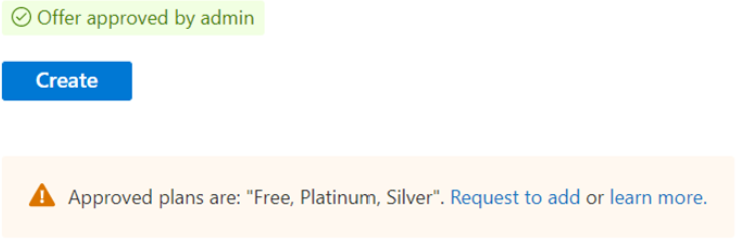 When private Marketplace within Azure portal is enabled, users see a notification that only approved offers can be deployed. Users can search the catalog using the search box and apply filters. Only approved products and approved plans can be deployed.