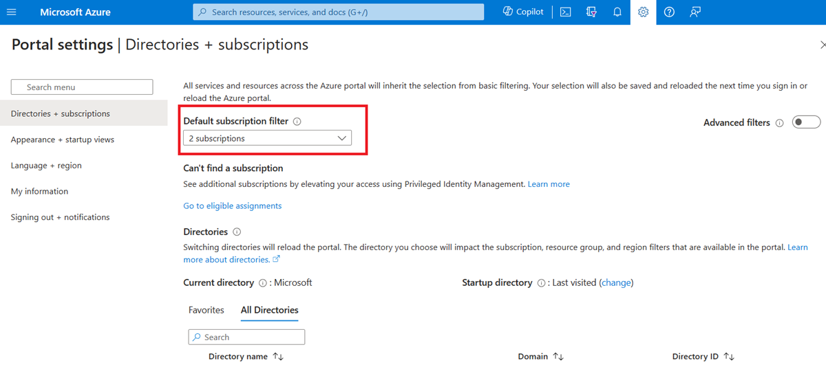 Select the Settings icon on the top right corner of the screen in the Azure portal to access the list of directories + subscriptions: