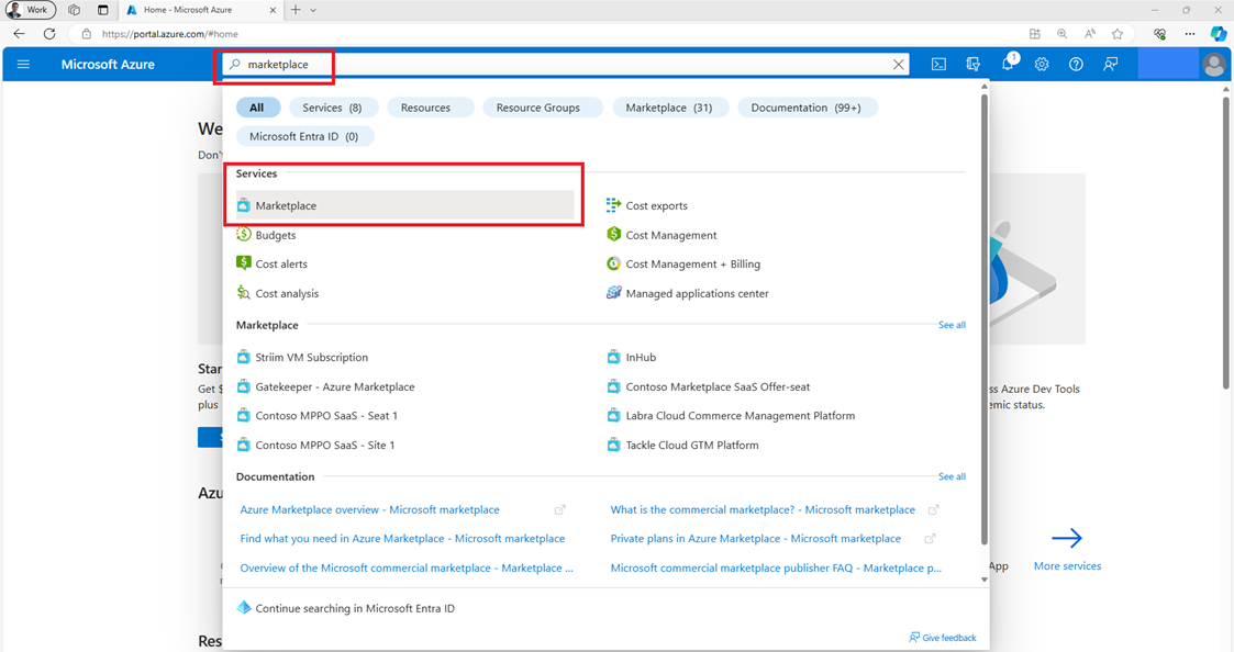 Navigate to Marketplace in the Azure portal. Search for Marketplace in the search box and select the Marketplace service: