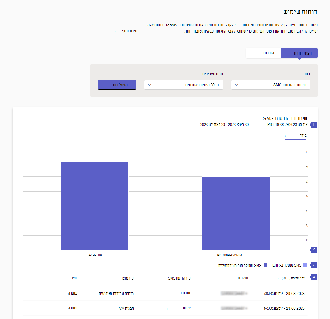 | 4 | הטבלה מספקת לך מידע מפורט על כל הודעת SMS שנשלחה במהלך טווח התאריכים שנבחר.