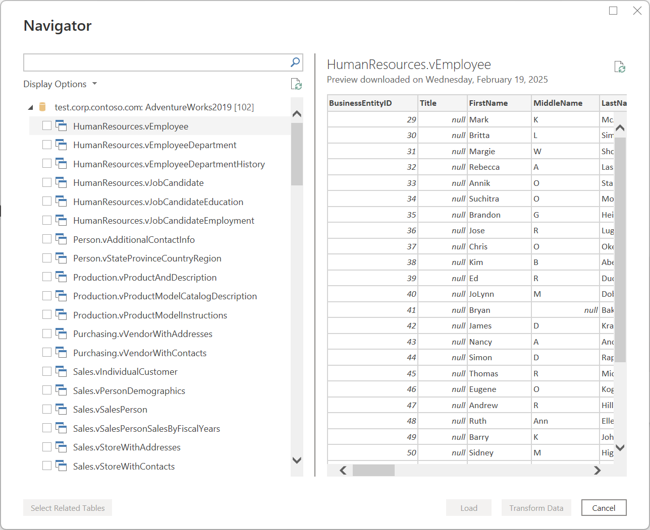Each data connector follows a standard experience as explained in Getting data. This standardized experience has a stage called Data Preview. In this stage, you're provided with a user-friendly window to select the data that you want to get from your data source, if the connector allows it, and a simple data preview of that data. You can even select multiple data sets from your data source through the Navigator window.