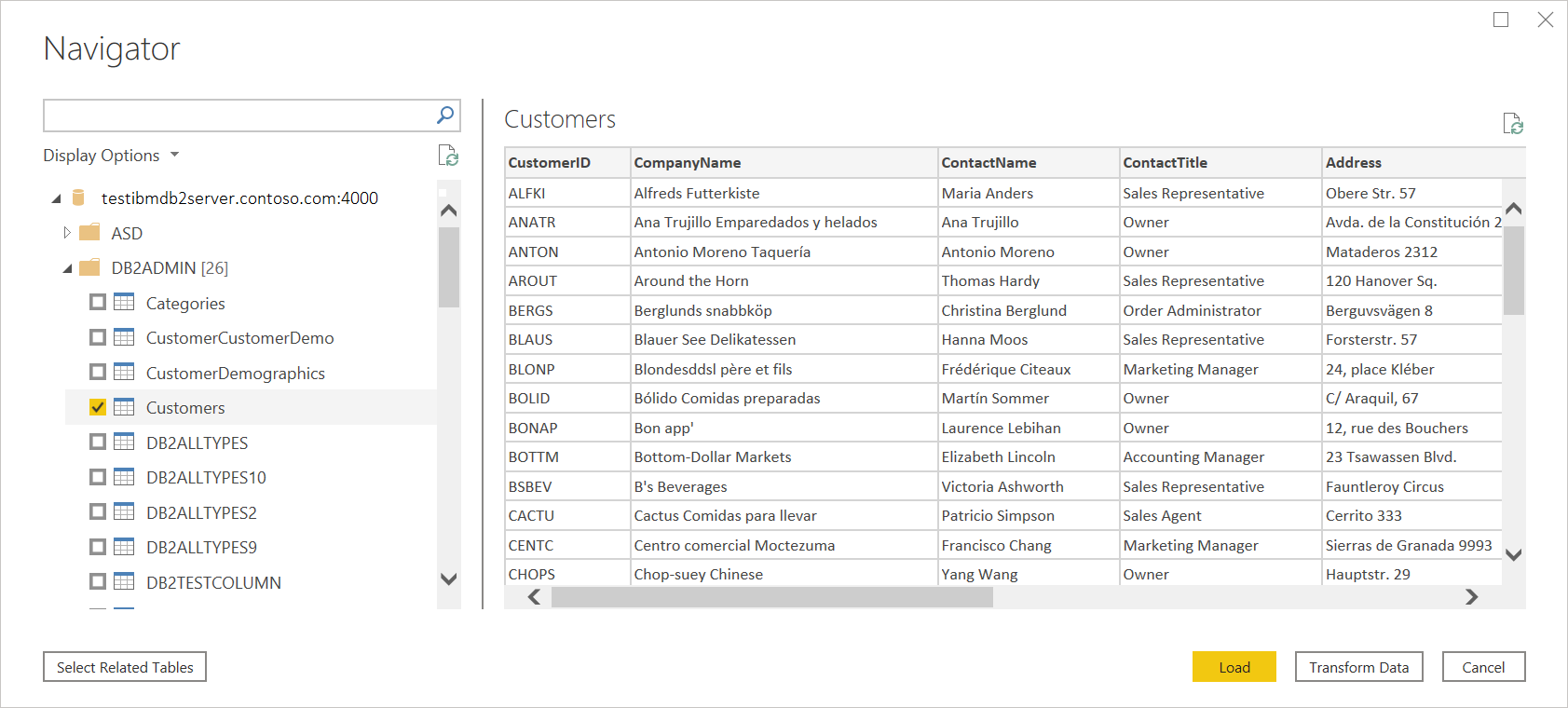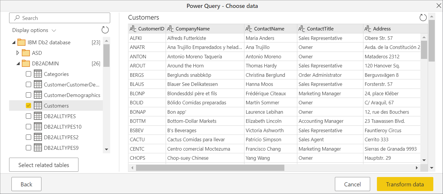 Using Power Query, connect to the IBM Db2 database and retrieve a list of schemas, tables, and views. The Power Query IBM Db2 database connector autocreates the package NULLID.MSCS001, and then grants execute on the package to public.