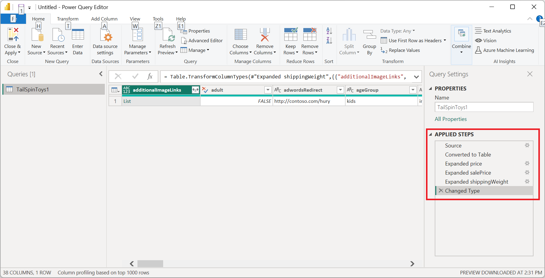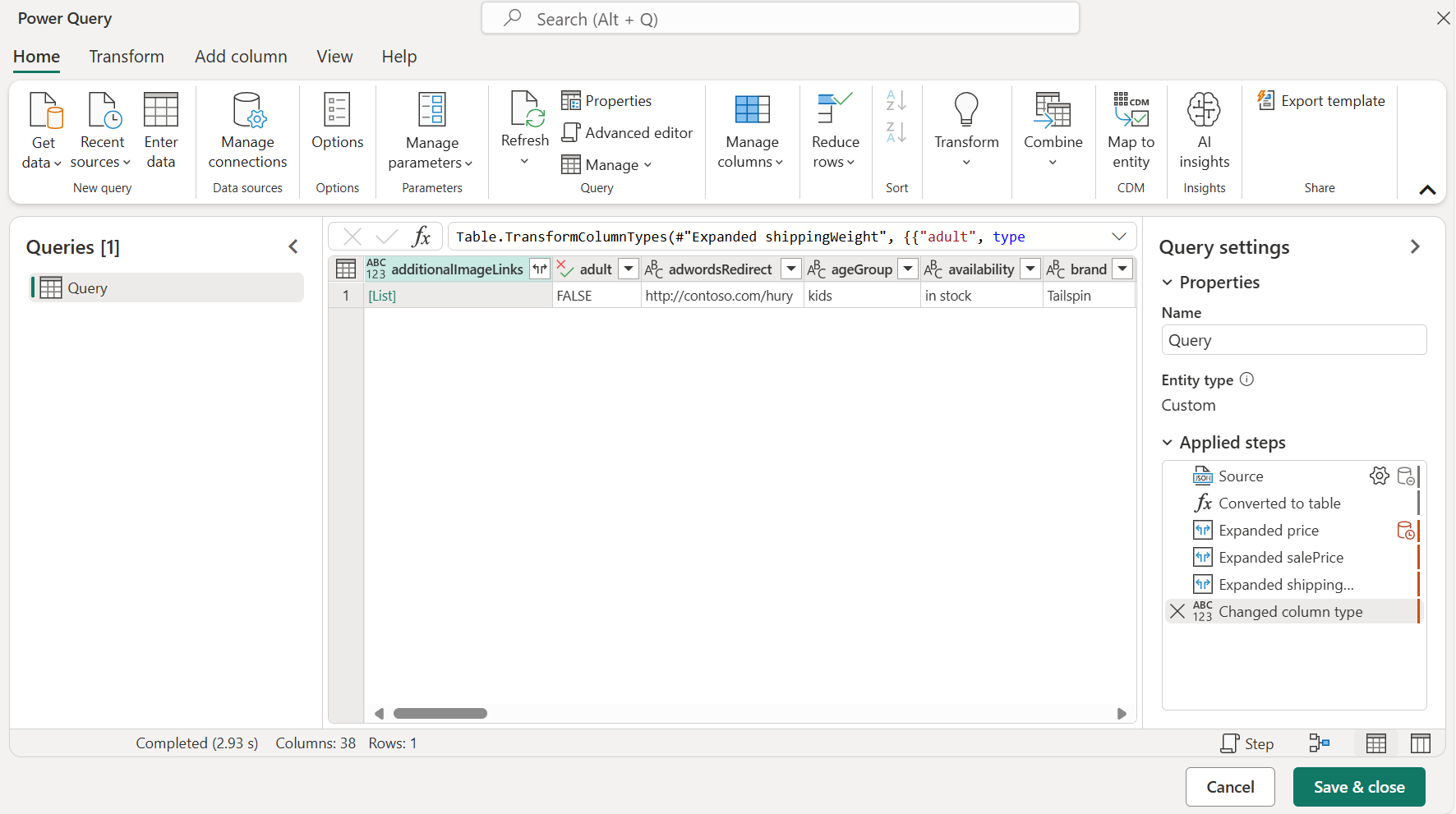 Loading the JSON file automatically launches the Power Query editor. Power Query uses automatic table detection to seamlessly flatten the JSON data into a table. From the editor, you can then continue to transform the data if you want, or you can just close and apply. More information: Automatic table detection from JSON files