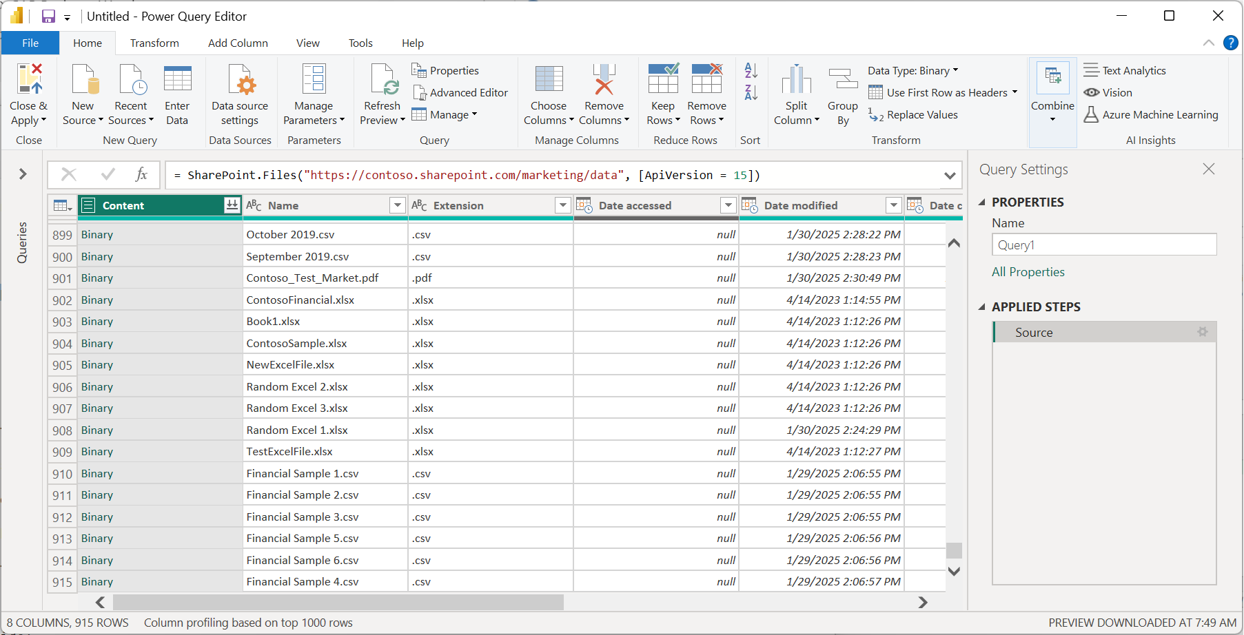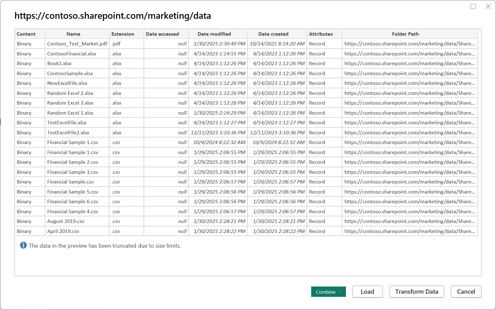 Select Combine & Transform Data to combine the data in the files of the selected SharePoint folder and load the data into the Power Query editor for editing. Or select Combine & Load to load the data from all of the files in the SharePoint folder directly into your app.