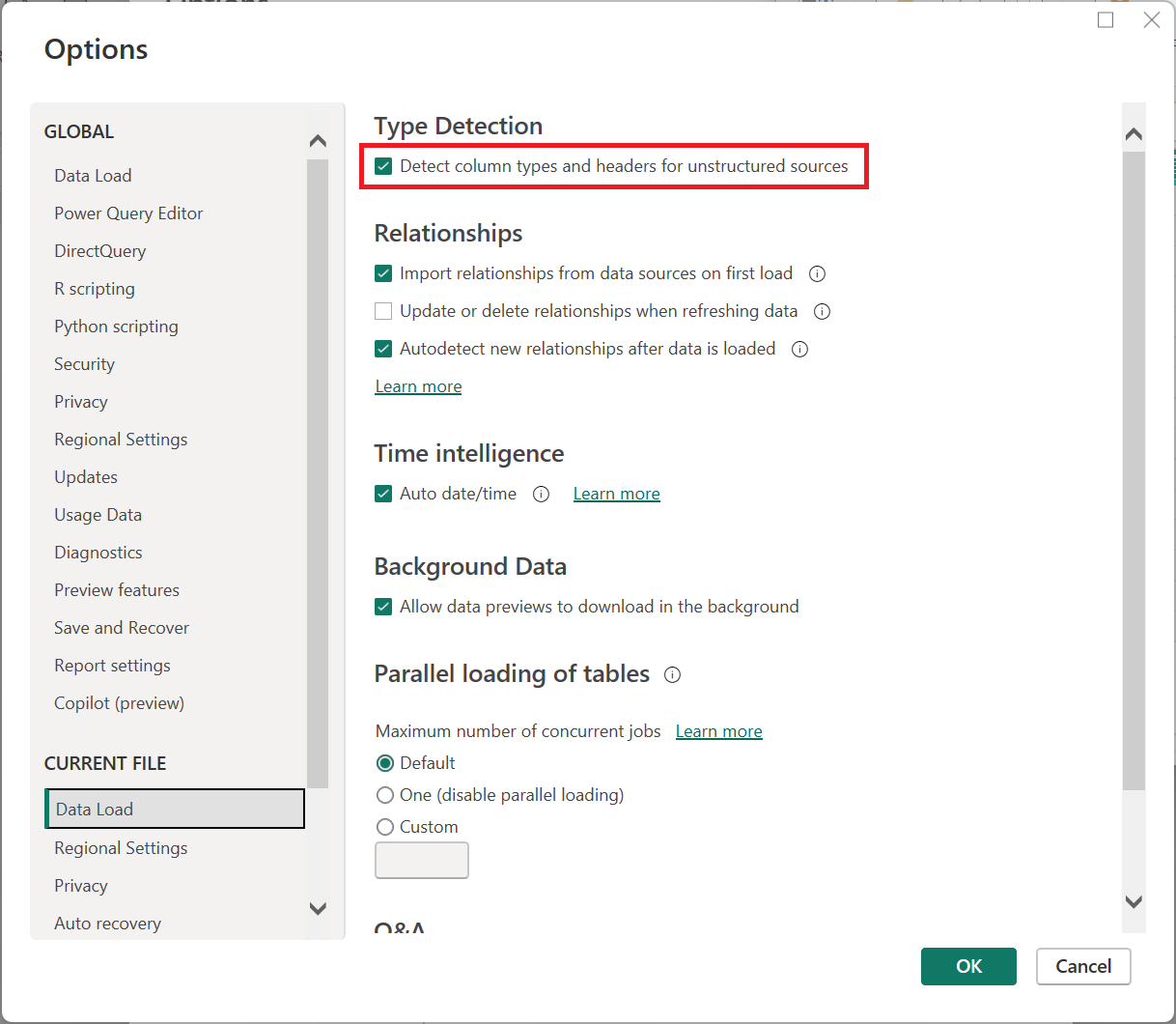 On the Home tab, select Options, and then select Data load under the Project options. Select the Automatically detect column types and headers for unstructured sources check box.