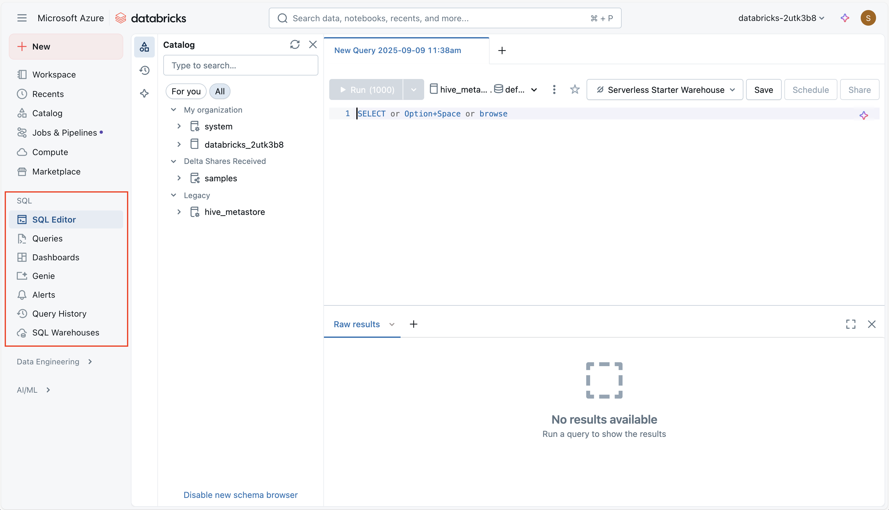אנליסטי נתונים שמקיימים אינטראקציה בעיקר עם נתונים באמצעות SQL יכולים להשתמש במחסנים של SQL ב- Azure Databricks. ממשק המשתמש של Azure Databricks Workspace מספק עורך SQL מוכר, לוחות מחוונים וכלי תצוגה חזותית אוטומטיים כדי לנתח ולהציג נתונים באופן חזותי ישירות בתוך Azure Databricks. עומס עבודה זה אידיאלי להפעלה של שאילתות אד-הוק מהירות ויצירת דוחות מערכות נתונים גדולות.