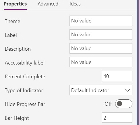 When a maker configures a code component, the properties defined in the manifest are available for configuration. This image shows how the above manifest for a progress indicator component is shown to a maker in the application designer. It allows them to see the available properties and customize them.