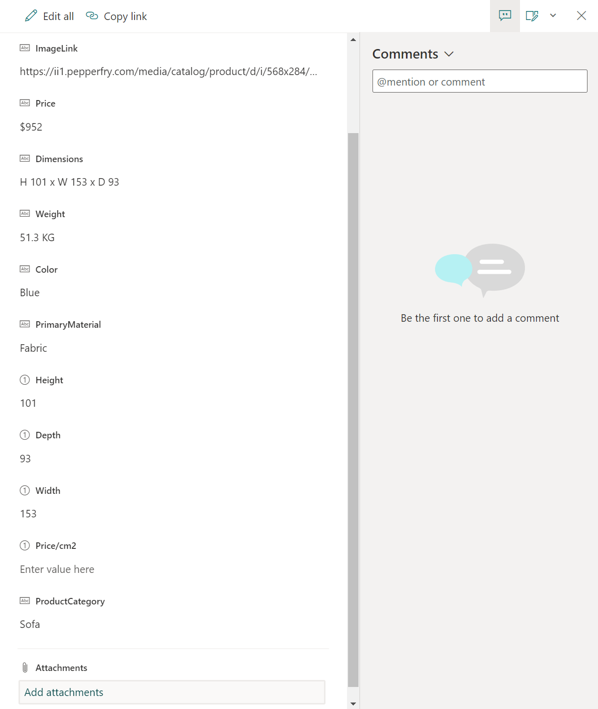 בחר פריט מהרשימה ולאחר מכן בחר באפשרות הוסף קבצים מצורפים. בחר את התלת-ממדי (קובץ .glb) או Image ( קובץ.jpg) בקובץ Power Apps המותאמת אישית. בצע את אותו הליך עבור כל הפריטים ברשימה.