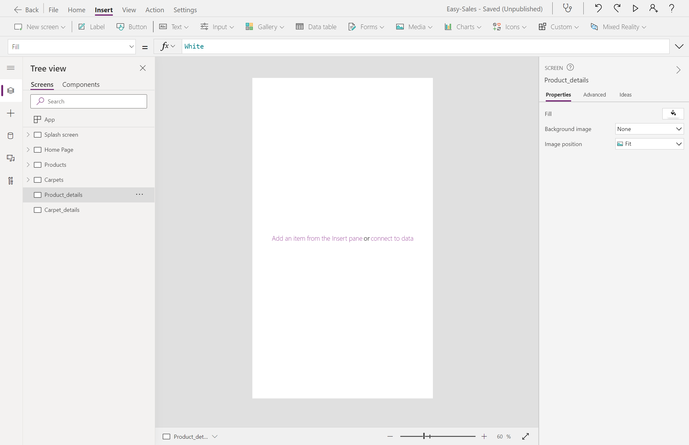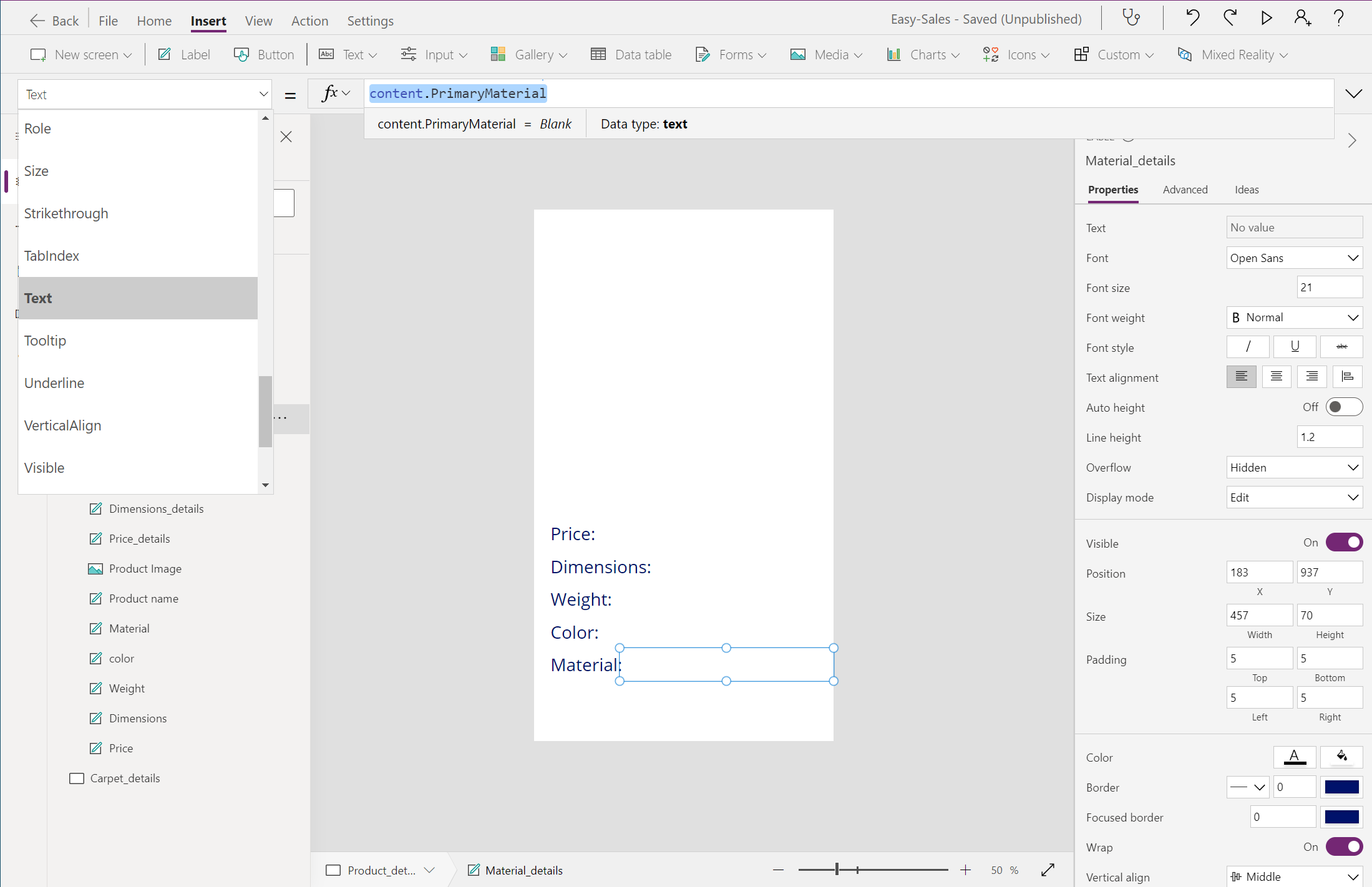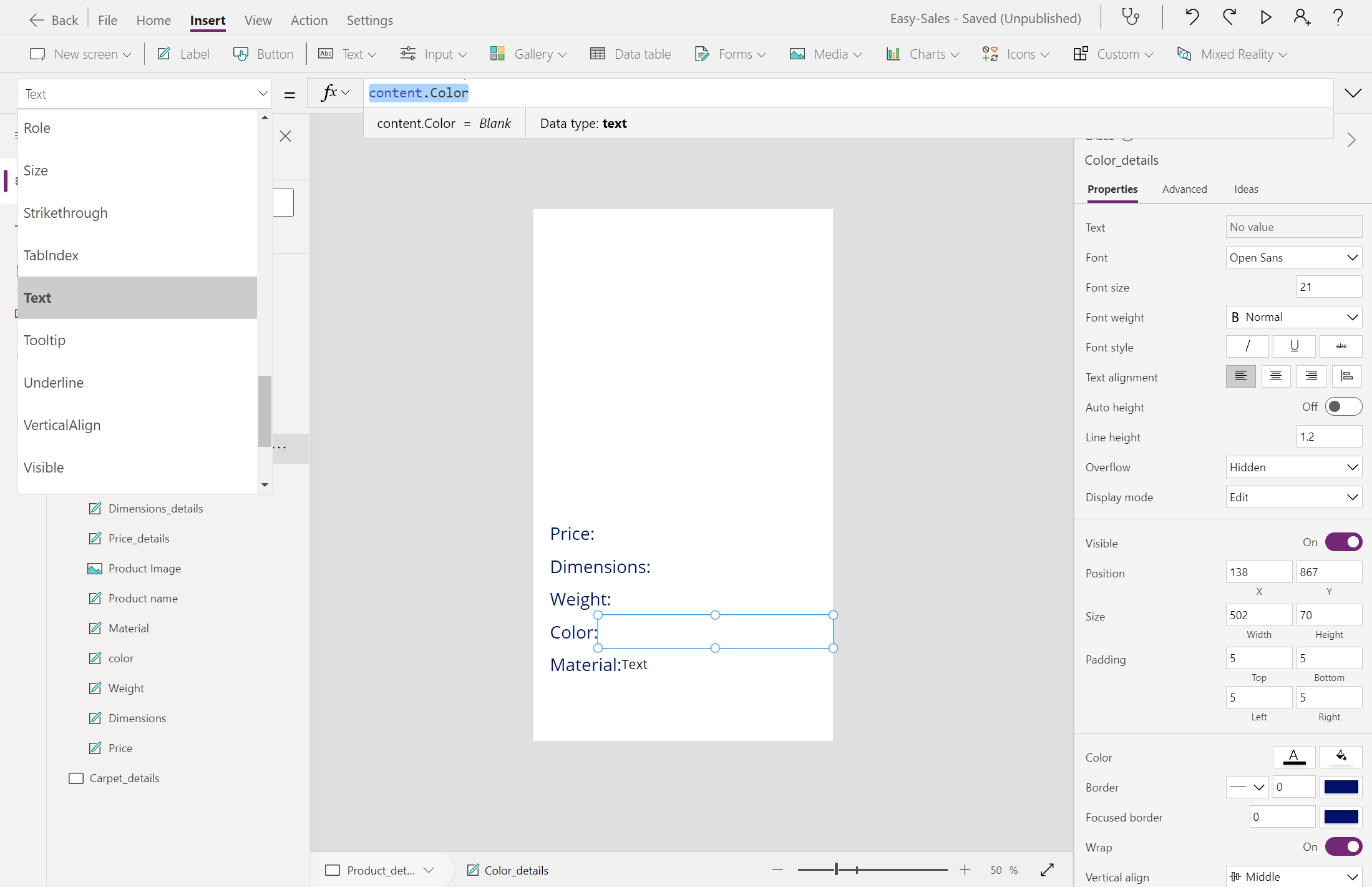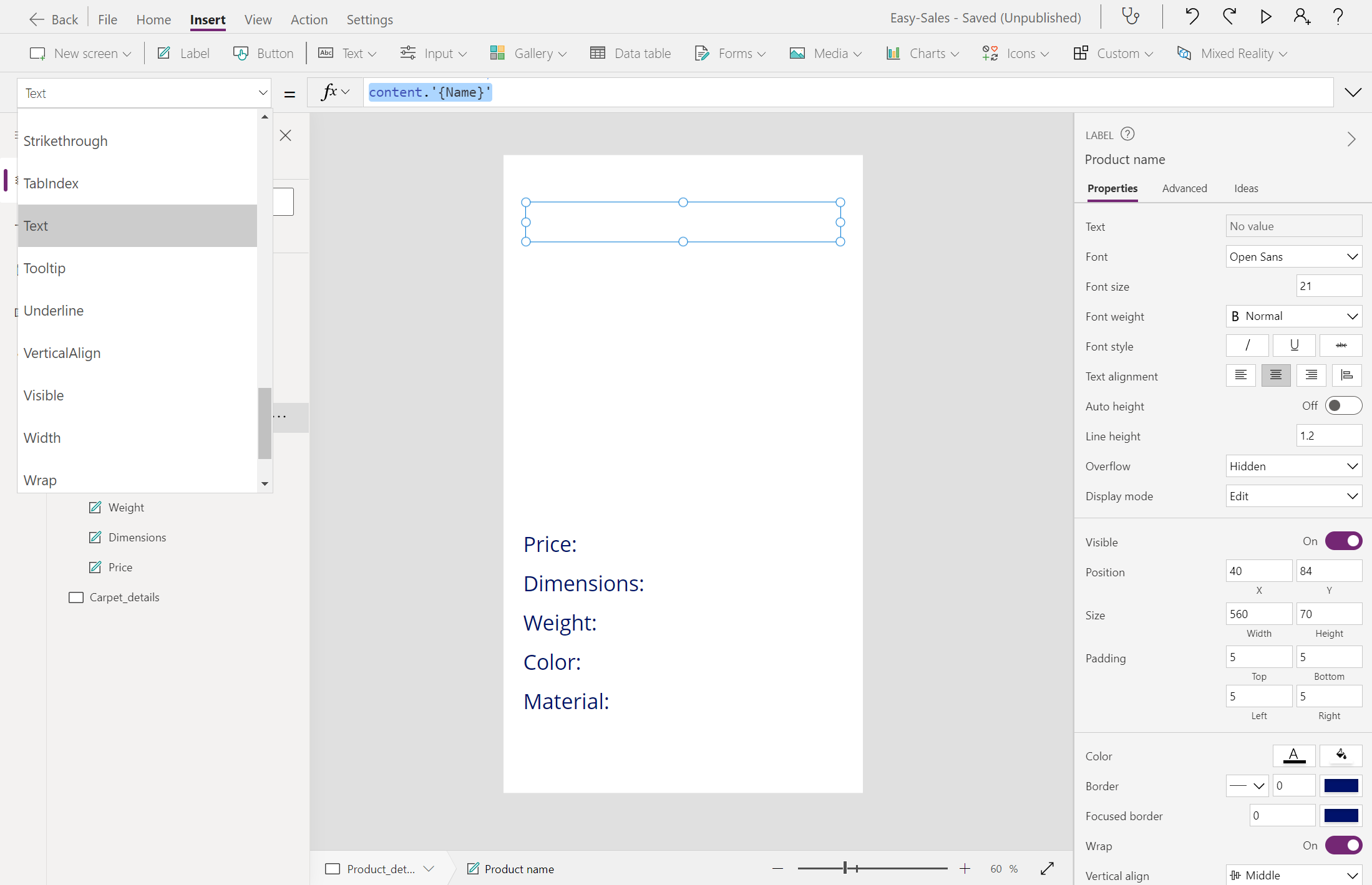 Navigate(Product_details,ScreenTransition.Cover,{content : ThisItem})Navigate(Carpet_details,ScreenTransition.Cover,{content_carpets : ThisItem})נתחיל לבנות את דף Product_details על-ידי הוספת כמה תוויות, כגון Price, Dimensions, Weight, Colorו- Material. באפשרותך לערוך את הטקסט בתוך התווית, תוך הוספת הטקסט הרצוי בתוך המאפיין טקסט של אותו תווית. שנה את שם תוויות בהתאם.